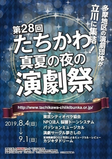今年で28回目を迎える演劇祭。多摩地域で活動している劇団が、真夏の立川に集結します。日時:2019年8月4日(日)~9月1日(日)会場:たましんRISURUホール(立川市市民会館) 小ホール舞台体験ワークショップも参加者募集中です。(7/5〆切)詳しくは、公益財団法人立川市地域文化振興財団HPへ http://www.tachikawa-chiikibunka.or.jp/tag/engekisai/たましんRISURUホール (立川市市民会館) 〒190-0022 東京都立川市錦町3-3-20 TEL:042-526-1311 FAX:042-512-5693