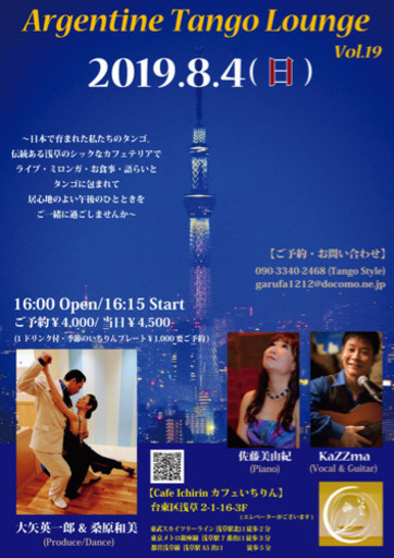 16:00open 〜18:30ピアノとギターのデュオ KaZZmaの歌プロダンサーによるデモ。ダンスタイムもございます。是非ご参加下さい。タンゴは人。人がいる街に良く似合います。ご一緒に楽しみませんか?¥4000- 1ドリンク付き いちりん季節のプレート(¥1000-)はご予約にて受け賜ります。お問い合わせ、ご予約は、メール garufa 1212@docomo,ne.jp