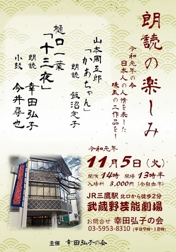 【日本朗読界の第一人者・幸田弘子の限定朗読会】幸田弘子が最も得意とする樋口一葉の作品から『十三夜』を朗読小鼓の名手・今井尋也が共演もう一つの朗読は飯沼定子による山本周五郎「かあちゃん」・武蔵野芸能劇場は三鷹駅北口から徒歩2分・154席の小さな劇場でのとっておきのひととき・本物がすぐそばで聞けるめったにないチャンス