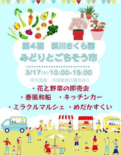 新川さくら館にてみどりごちそう市開催今年初のメダカ掬いをやりますその他キッチンカーや様々なイベント、野菜販売などございますので是非是非おまちしています〒134-0091 江戸川区船堀7丁目15番12号 新川さくら館にて開催10時~3時
