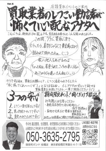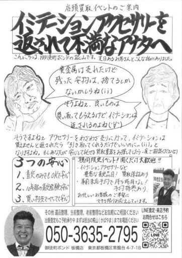 オーケー南六郷店内 消防署側入口エスカレーター先前イベントスペースにて 店頭買取イベントを開催!ご不要で使わない物がその場で現金になります。鑑定無料! 見るだけ、聞くだけ大歓迎です。ジモティ見た!と店頭で仰っていただくと買取品目に応じて買取率UP!また、LINEで事前来店予約するとお得がいっぱい!使う予定の無いもの、デザインが古い、壊れている等々自宅で眠っているものをお持ちください。豊富な鑑定品目なので捨てる前に是非査定にお越しください。主な査定品目;※貴金属※指輪、ネックレス、ピアス、イヤリング、ブローチ、トップ、ブレスレット、アクセサリー、金杯、銀杯、コイン、メダル、メッキ、ダイアモンド、ジュエリー、パール、真珠、珊瑚、ルビー、サファイア、エメラルド、立爪リング、婚約指輪、結婚指輪、翡翠、金歯、入れ歯、タイピン、カフス、トロフィー、万年筆、メガネ、ライター、置物、切れた、千切れた、時計のコマなどや壊れたアクセサリー メッキかも?などなんでもOK!!※時計※ロレックス、オメガ、シャネル、カルティエ、ピアジェ、パテック、I W C、オーデマ、バシュロン、ショーメ、ブレゲ、ジャガールクルト、ウブロ、ゼニス、SEIKO、G S、シチズン、カシオ、タグホイヤー、ブライトリングなどノーブランドも査定は無料!!※ブランド品※ルイヴィトン、シャネル、エルメス、プラダ、グッチ、ディオール、カルティエ、ハリーウインストン、ショーメ、バンクリ、ブルガリ、ブシュロン、ショパールなど※切手※普通切手、記念切手、特殊切手、年賀切手、ふるさと切手、中国切手などシートだけでなくバラでも大丈夫!!※テレカ※未使用品に限りますが、穴あきでも期間内は店頭でキャンペーンあり^_^※古銭※現行貨幣、失効貨幣、記念硬貨、金貨、銀貨、大判、小判、寛永通宝、天保通宝、外国古銭など国内外の記念メダルもOK※金券類※QUOカード、商品券、図書券、交通系カードなどなど※その他※着物、毛皮、カメラ、レコード、酒類などどんな物でも一度ご相談ください