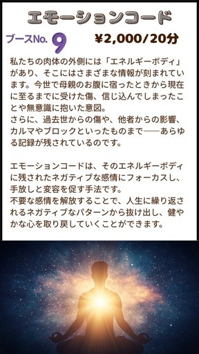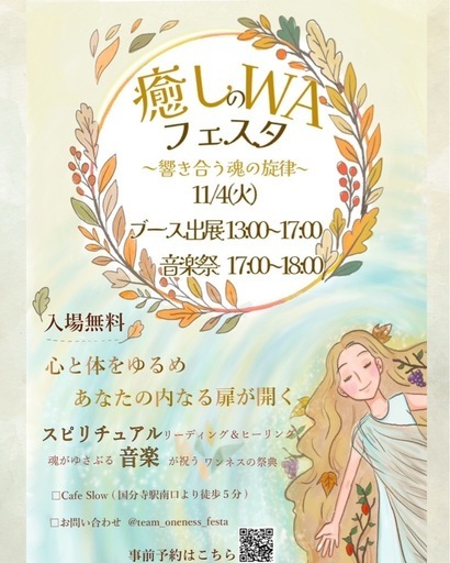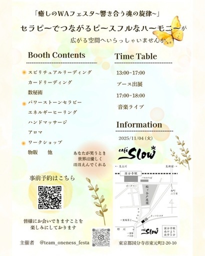 ブースNo.9で出店します。事前ご予約受付中①過去のネガティブな感情を解放する エモーションコード ¥2,000②チャクラ浄化エネルギーヒーリング ¥2,000 現地払い(現金又はPayPayのみ)下記リンクからご予約いただけます。 https://relieve-aoyama.crayonsite.net/p/11/13:00-13:20 13:30-13:5014:00-14:2014:30-14:5015:00-15:2015:30-15:5016:00-16:2016:30-16:50他にもリーディングやヒーリングなどが出店されます。ホームページ作成中、7日以降にできましたらまたこちらに掲載させていただきますので、今しばらくお待ちください。⭐︎*⭐︎⭐︎*⭐︎⭐︎*⭐︎*⭐︎⭐︎*⭐︎⭐︎*⭐︎*⭐︎⭐︎*⭐︎⭐︎*【日時】11月4日(火) 一部 ブース出展 13:00-17:00 二部 音 楽 祭 17:00-18:00【チケット】チケットなし入場無料各ブースを受ける場合はセッション代がかかります。飲み物販売ありお食事の提供はありません【場所】国分寺駅南口5分Cafe Slow(カフェスロー)【主催】インスタアカウント@team_oneness_festa