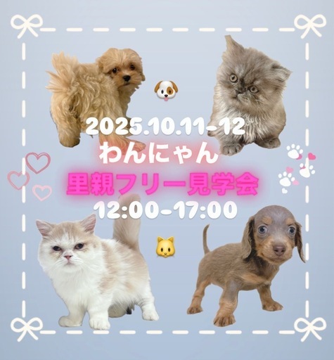 .🐶🐱10/11(土)12(日)の二日間💝✨12時から17時まで里親フリー見学会開催します🎉🥳かわいい子達が待ってます❣️来られる際は候補の子を2〜3頭くらいまで事前に決めておいてもらえるとやり取りがスムーズです。混み合っている時はご予約の方優先になりますので当日来られる場合でも事前にご希望の子を決めてご連絡いただけると助かります。ご希望の子指定でご予約も承っております。予約の方が優先ですが時間内であれば予約なしでも見ていただけます。写真以外の子も参加予定です。ご参加お待ちしております🎵【参加予定の子】🐶・トイプードル・ポメラニアン・ペキニーズ・豆柴・MIX犬🐱・マンチカン・エキゾチック・スコティッシュ・ベンガル・ブリティッシュ▶︎わんにゃん里親相談所▶︎〒195-0061東京都町田市鶴川2丁目14-23▶︎12時〜17時✼••┈┈••✼••┈┈••✼••┈┈••✼••┈┈••✼🐶🐱この度新たに里親募集のためのわんにゃん里親相談所が出来ました🐾🐾親いぬちゃん、親ねこちゃんを引退した子やハンディを抱えた子たちと素敵なご家族様とのご縁を結ぶ為の相談所になります🐈💐プロフィール欄のリンクにある🔗ペットステーションにも募集の子を掲載中✨わんにゃん里親相談所専用HPも準備が進んでおりますのでぜひcheck☑️お願い致します🙇♀️🙇♀️お問い合わせは各HPのお問い合わせからお願い致します!里親募集は通常販売とは違って応募がとても多いためお電話での対応はできかねます🙅♀️早い者勝ちではなくテレビ電話でリモートマッチングして里親候補の方にのみ事業所で見学いただくようにしています。そのためお問い合わせ後に質問事項をお送りしてお答え頂いております🙇♀️返答いただけなかったり、本文をよく確認いただけない場合は里親候補になっていただけるかの判断ができないためご対応は難しくなります。上記、ご了承下さいませ。✼••┈┈••✼••┈┈••✼••┈┈••✼••┈┈••✼ https://www.faith-pet.com/.