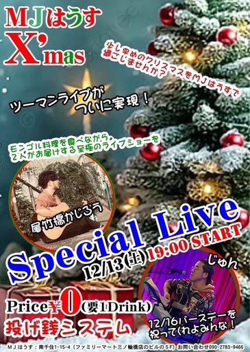 🎄MJはうすX'mas🎅Special Live🎵少し早めのクリスマスをMJはうすで過ごしませんか?🪅ツーマンライブがついに実現♪じっくり歌やおしゃべりを聴きながら呑めるライブです。当日は料理長いますので、当店自慢のモンゴル料理🇲🇳も食べられます(^^)(マスターじゅん)モンゴル料理を食べながら、2人がお届けする至極のライブショーをお楽しみください😆皆さまのお越しをお待ちしております🤗🎤尾竹橋かじろう🎤じゅん(MJはうすマスター)じゅんさんは12/16バースデーです🎊🎂🎁🎉【日時】12月13日(土)19:00スタート【会場】MJはうす荒川区南千住1-15-4トリニティ三ノ輪ビル5階1階がファミリーマートです。日比谷線三ノ輪駅より徒歩4分🚶♀️【Price】¥0(要1Drink)投げ銭システム🔵お申込先 https://forms.gle/NjUAr1gHxVbH4AQVA