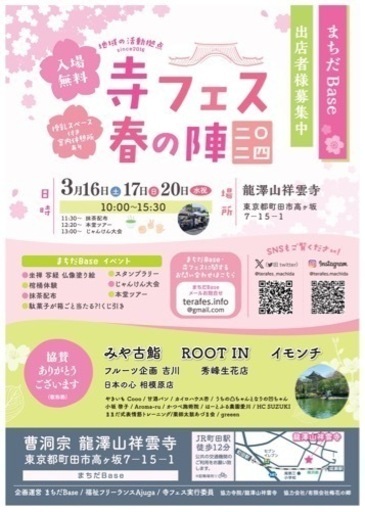 寺フェス春の陣の出店者を募集します!出店枠まだまだあります開催日3月16日17日20日時間10時~15時半出店77/日キッチンカー5/日※キッチンカーは全日程満員となりました出店は1日から可能シェア出店可能出店料2000円~6000円(区画により変わります)出店料には、テント テーブル 椅子等の備品が含まれていますので、手ぶらで出店が可能!資料請求のみもOKですのでまずはお問い合わせくださいterafes.info@gmail.com 和智ご連絡お待ちしてます
