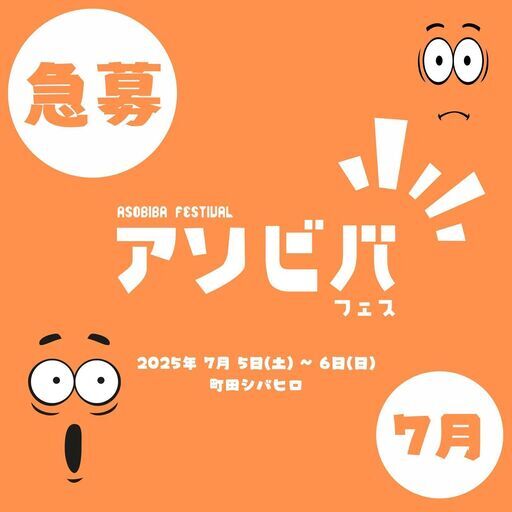 【イベント概要】イベント名:第4回 ASOBIBA FES - アソビバ フェス日程:2025年7月5日(土曜日)・6日(日曜日)営業時間:11:00 - 17:00会場:町田シバヒロ住所:〒194-0021 東京都町田市中町1丁目20−23主催:アソビバフェス実行委員会企画/運営:&YOU ENTERTAINMENT後援:ひらつかキッチンカー協会(組合)ECU(イベントクリエイターユニオン)雨天決行・荒天中止巨大トランポリンが登場!!さらに!!パーフェクトピッチングに!?レゴブロックスペースに!遊び道具が追加!?【出店条件】① 出店業種について・キッチンカー・縁日屋台(飲食を除く)例:射的/輪投げ/ボールすくい/ハンドメイド/ワークショップ/フリマなど・企業出店(PR・販促活動)※ 飲食屋台(縁日屋台(飲食物の調理・販売をテントで行う営業方法))については出店できません。② 出店料について・キッチンカー1日間出店:16,000円(税込)2日間出店:30,000円(税込)・縁日屋台1日間出店:6,000円(税込)2日間出店:10,000円(税込)・企業出店1日間出店:7,000円(税込)2日間出店:13,000円(税込)③ 営業許可証について飲食の調理販売をされる場合は営業許可書を東京都内で取得してください。また、都内での営業が可能な有効期間内の営業許可証をご提出ください。④ PL保険について生産物賠償責任保険を主催(運営)より提出の指示がある場合はご提出ください。⑤ 提出データについて・販売する商材の写真・ロゴ写真または上記の写真のどちらかをご提出ください。⑥ ゴミ袋の設置について飲食物及び廃棄物の出る形での営業をする場合は飲食店に問わず店頭にゴミ袋をご設置ください。⑦ 無料券の配布についてコンテンツ(トランポリン・パーフェクトピッチング)を利用される場合は各店 600円分につき1枚のコンテンツ一回無料券をご配布ください。⑧ キャンセル禁止について出店確定後のキャンセルは原則としてできません。⑨ 出店事業者のLINEグループ参加について出店が確定した事業者については出店者のLINEグループにご参加ください。※ 運営マニュアル・ブース位置・その他連絡事項やご相談はこちらで行います。※ 出店確定通知は、メールにて行います。必ずgmailアドレスをご用意ください。【各種期限について】① 応募期限について2025年6月13日(金曜日)午前10時まで② 出店確定通知について2025年6月13日(金曜日)午後17時まで③ マニュアル送付について未定④ 各種提出期限について2025年6月20日(金曜日)午前10時まで⑤ 出店料のお支払いについてご請求書到着から3曜日以内(土日祝含まない)※ お支払い期限のご延長はできません。あらかじめご用意ください。【応募方法】以下のリンクからご応募ください。 https://forms.gle/z492E32dvgq2zjhm6本ジモティでは、ご返信ができません。お問い合わせについては以下のメールアドレスよりお問い合わせください。andyou.official.host@gmail.com