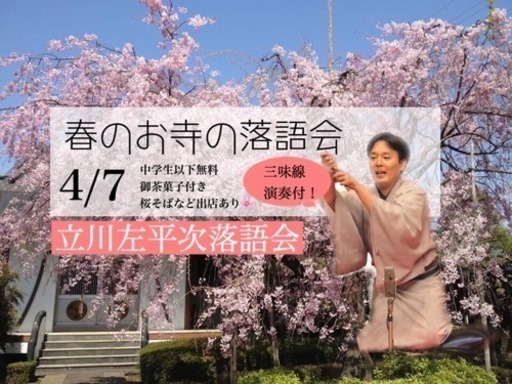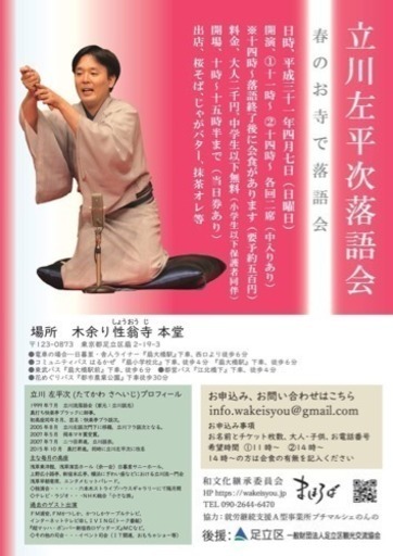 〜中学生以下無料☆ご家族で楽しめる春のお寺の落語会〜浅草在住の落語家として活躍中の立川流真打「立川左平次」師匠を呼びして、足立区扇の「木余り性翁寺」で落語会を開催します。「木余り性翁寺」は、伝説のお姫様「足立姫」にゆかりのある、江戸時代に流行した、春の「江戸六阿弥陀」巡礼のお寺としても高名です。境内には・桜そば(かけそば)・じゃがバター・きなこ棒・抹茶ドリンク等の出店も並びます。14:00の落語会の後には茶話会があります(要事前予約、落語弁当500円)同日開催の「舎人公園千本桜祭り」に向けた「花めぐりバス」をご利用の方には特典としてドリンク100円引きです。子供たちに本物の和文化を伝えるコンセプトの「和文化継承委員会まほろば」主催のイベントでは中学生以下のお子様は無料(小学生以下は保護者同伴)となっています、是非ご家族でもご参加ください^ ^【概要】日時、平成31年4月7日(日曜日) 場所 木余り性翁寺 (しょうおうじ) 〒123-0873 東京都足立区扇2-19-3開演、①11時~ ②14時~ 各回2席(中入りあり)※14時~落語終了後には茶話会があります(要予約500円)料金、大人2000円、中学生以下無料 (当日券あり)御茶菓子付き開場、10時~15時半まで。桜そばなど出店あり🌸●電車の場合…日暮里・舎人ライナー『扇大橋駅』下車、西口より徒歩6分●コミュニティバス はるかぜ 『扇小学校北』下車、徒歩4分 『扇大橋駅』下車、徒歩6分●東武バス『扇大橋駅前』下車、徒歩6分 ●都営バス『江北橋下』下車、徒歩4分●花めぐりバス『都市農業公園』下車徒歩30分【お申込み、お問い合わせはこちら】11:00〜の部お申込みはこちら https://goo.gl/forms/gNiZPee1FwwGIrLw214:00〜の部お申込みはこちら https://goo.gl/forms/m2qbH1HutDR3yHCt2主催:和文化継承委員会まほろばE-mail info.wakeisyou@gmail.comURL http://wakeisyou.jp協力:就労継続支援A型事業所プチマルシェのんの後援:足立区 一般財団法人足立区観光交流協会【立川 左平次(たてかわ さへいじ)プロフィール】1999年7月 立川流落語会真打ち快楽亭ブラックに師事。初高座同年8月、芸名:快楽亭ブラ談次。2005年8月 立川左談次門下に移籍、立川フラ談次となる。2007年5月 岡本マキ賞受賞。2007年7月 二つ目昇進、立川談奈。2015年10月 真打昇進。同時に立川左平次に改名主な毎月の高座浅草演芸ホール(余一会)日暮里サニーホール、、上野広小路亭、新宿末広亭、横浜にぎわい座等における立川流一門会。浅草早朝寄席、エンタメヒットパレード。◇独演会・・・・・・紀尾井小ホール。横浜にぎわい座。浅草東洋館。雷5656会館。◇テレビ・ラジオ・・・NHK総合「小さな旅」過去のゲスト出演FM浦安、FMかつしか、かつしかケーブルテレビ、インターネットテレビ@LIVING(トーク番組)『超マッハ・ボンバー新宿西口ゲッターズ』MCなど。◇その他の司会・・・イベント司会(IT関連、おもちゃショー等)