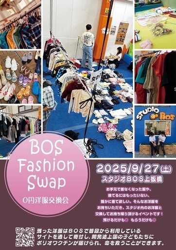 「第17回BOS Fashion Swap~無料洋服交換会~」年末年始の大掃除ででた不用品を整理してぜひお越しください❄⛄🎿🏂今回は主催者がシール帳を持っていきますので!持っている子はぜひ!シール交換もしましょー🥳💜お手元で着なくなった服や、捨てるにはもったいない、誰かに着て欲しい、そんなものをお持ちいただき、スタジオ内のものと交換してお持ち帰り頂けるイベントです👕👚預けるだけも◎もらうだけも◎残った服等は寄付し、開発途上国の子どもたちにポリオワクチンが届けられ、命を救うことができます🫶どなたでもご参加いただけます🙆♀️新品のものやブランド品もあって見てるだけでもとっても楽しいです🥰◆開催日時:2026/2/7土曜日◆場所:スタジオBOS上板橋◆時間:11:00~13:00◆参加費:無料◆預けられる物:添付画像のものは全て回収OK!予約は不要です。当日洋服等お持ちになり、指定の場所に置いていただいたら好きな洋服をお持ち帰りください👗質問等ございましたらお気軽にお問い合わせください!また、この活動を広めたいと思っています。少しずつ人が増えてきていますが (ありがとうございます🙇♀️)もっと広めるためにお友達や家族等誘ってきていただけると嬉しいです🙇♂️メッセージをいただければチラシのデータも送らせていただきますのでぜひご協力お願いします!前回の様子⬇️ https://www.instagram.com/reel/C4FB5QsvnKU/?igsh=cXI4NGNiZ28wMTFs