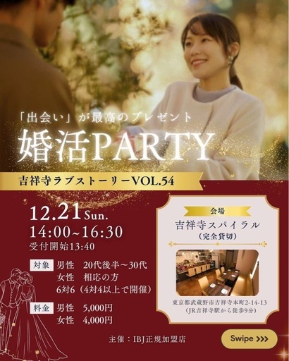 現在20代女性4名エントリー中💖💖💖🎄「出会い」が最高のプレゼント🎄婚活PARTY🩷吉祥寺ラブストーリー VOL.5412.21 Sun.14:00〜16:30受付開始 13:40【対象】男性 20代後半〜30代女性 相応の方6対6(4対4以上で開催)【料金】男性 5,000円女性 4,000円【会場】吉祥寺スパイラル(完全貸切)東京都武蔵野市吉祥寺本町2-14-13(JR吉祥寺駅から徒歩9分)主催:IBJ正規加盟店✨まずはお問い合わせから✨✔︎ 結婚に繋がる出会いをしたい方✔︎ 話しやすさ、居心地の良さからお相手を見つけたい方⚠️ 非常に人気のパーティーのため、お問い合わせの段階で満席の場合がございます。予めご了承ください🙇♀️CONTACT USお気軽にメッセージでお問い合わせください😆💖THE LOVE STORY💖