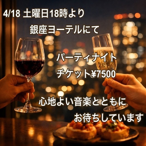❤️主催者やヘルプスタッフは女性ですので 女性のお一人様参加も安心して楽しめる❤️🔸洗練された場で洗練された時間を楽しみませんか🔸🔸大人の新しい出会いと素敵な交流を🔸🔸特別にお呼びするスペシャル人気DJ3名(マハラジャ所属の方々)による落ち着いたR&Bを聞きながら🔸🔸英系ホテルの日本(銀座)旗艦店の貸切ラウンジにて🔸🔸お洒落なビュッフェと素敵なバーでフリーフロー🔸🔹🔹🔹都内在住の優良ビジネス外国人も参加しますが日本語ができる方も多数、またプロの同時通訳者も参加しますのでご安心ください🔹🔹🔹🔸椅子席もご用意してますが立食式なので 自由に移動しながらたくさんの方と出会える為 とても有意義&気楽🔸🔹皆様お一人参加ですのでお気軽に🔹🔹人見知りの方や会話が苦手な方も楽しめるよう、ベテラン男女パーティスタッフがご案内&リード🔹🔹中高年の恋活、婚活、結婚生活の悩み、離婚の悩みなどまた、友達作りや人間関係のお悩み等もお気軽にいつでもご相談くださいね!🔹もちろん秘密厳守㊙️〜概要〜【日時】4/18 土曜日 6時pm ※受付は17:45より【場所】外国人用の英系大手ホテル 銀座ヨーテルラウンジ貸切※ビュッフェ式立食、バーカウンターでお飲み物受け取り式ですが、椅子席もあり。食べ放題、飲み放題。※特別にお呼びする人気DJお2人によるスペシャルR&B 付き。曲リクエスト可。【パーティチケット】¥7500※エントランスでの渋滞で皆様をお待たせしない為、クレジットカードや銀行振込などの前払いを推奨しておりますが、当日受付にて現金かPayPayも可◇◇パーティの協賛が外資系半導体会社の為、多少テクノロジー関係の方や大学教授、また大学病院医師の方や、研究職の外国人等も参加しますが、プロの同時通訳もおりますのでお気軽に❣️外国人の友達作りもお楽しみに❣️◇◇◇◇主催者はバツ歴ありで今はパートナーあり、恋愛経験や人生経験をたくさん積んできた音楽イベント&パーティ会社経営者!恋愛カウンセリングや恋活婚活サポートも無料で善意でやってますので、ぜひお気軽にお越しくださいね❣️日々、皆様の色々なご相談も毎日、常にお聴きしております😊◇◇日本人だけではなく、外国人と知り合いたい、外国人の彼氏や彼女が欲しい、紹介して欲しい、等のご相談も随時受けております🌏◇お陰様でパーティに来てくれて50-60代で真剣交際スタートや結婚も平均1年に10組以上❣️◇◇でも結婚相談所やマッチング会社ではありませんので変な押し付けや勧誘は無し!◇◇ですが真剣に一日も早く結婚したい方には信頼できる結婚相談所をご紹介することは可能です◇パーティー主催会社ですので女子会や音楽イベント等も随時開催中◇◇❤️お問い合わせ、ご相談、お申し込み、はお気軽に😊❤️