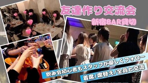 ☆10/26(日)新宿友達作り交流会~初参加&1人参加大歓迎~☆新宿のお洒落ラウンジバーを貸し切って友達作り交流会を開催します。友達作りやお酒を飲みながら週末の夜をお楽しみ下さいませ。※写真は以前開催したイベントになりますので雰囲気など参考にしてみてください。<オススメポイント>①初参加&1人参加大歓迎(人見知りの方もスタッフがフォロー)。②カジュアルな会ですので特にドレスコードはありません(服装自由)。③席移動や連絡先交換は自由(何回か席替えもします)。④1人参加9割、初参加7割程度です。⑤豊富なドリンクと美味しい料理でお腹いっぱい。10月26日(日)19:00-21:15【会場】BAR ベロベロバー(新宿区歌舞伎町2-27-8 アタミビル3F)※お店の名前は面白いですが黒を基調とした清潔感のある豪華内装…あの歌舞伎町の超人気店を完全貸切でイベントスペースとして使わせて頂きます。【時間】19:00-21:15※現地集合 18:55から入場可(遅刻早退自由)【費用】男性 3900円 女性 900円【定員】40名程度【内容】飲み放題+料理【支払い方法】当日受付にて現金のみの支払いです。(出来る限りお釣りがないようにお願い致します)【注意事項】※参加資格(20歳以上の未婚の男女)※ドタキャンもありです(キャンセルの場合は連絡ください)※受付後(参加費支払い後)のキャンセルは出来ません。※荷物置き場用意しています。※貴重品は各自で管理して下さい。なくなった場合保証は出来ません。※なかなか参加者の中に入れない等あればスタッフまで気軽に言って下さい。※女性数名+男性数名で幹事(スタッフ)をやってますので女性の方も安心して参加してください。【団 体】~東京交流パーティ~【公式HP】 https://tokyo-party-stay-gold.jimdofree.com【代 表】まーたん【参加申し込み】参加希望・お問い合わせの方は【投稿者にメールで問い合わせ】ボタンからして頂くか、下記メールアドレスまたはLINEまでご連絡ください。【メール】maa5630maa@i.softbank.jp【LINE URL】 https://line.me/ti/p/xZig8ZA7r8申し込み例→10/26(日)新宿友達作り交流会に参加希望です。【お名前(ニックネームも可)】