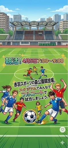 w杯イヤー4月5日の日曜朝、赤羽で一緒にボールを蹴りませんか?「とにかく楽しく!」をモットーにした11対11のフルピッチ・エンジョイサッカーを開催します。後3名募集「最近動けてないな…」「久しぶりに広いコートで走りたい!」というブランクのある方や、初心者の方も大歓迎です。スパイクOK、シャワー完備の綺麗な人工芝ピッチです!📅 日時: 2026年4月5日(日)07:00〜09:00(受付06:30〜)10分から20分をまわしていきます。📍 会場: 赤羽スポーツの森公園競技場 最高のピッチです。スパイク可💰 参加費: 1,500円👕 募集: 初心者・初中級・エンジョイ層激しい接触や指示出しはNG!怪我なく笑顔で終われる環境を大切にしています。お一人でも、友達との参加もOKです!参加希望の方は、コメントかDMをください!詳細をお送りします📩
