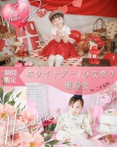 🍫ステラホワイトデー&ひな祭り撮影会🍫男の子も可愛いですよー!ぜひおめかししてご参加ください✨——【日時】※所要時間出入り込15分程10:00〜14:00✴︎3/5〜7【ディレクター料金】編集済み高画質データ納品(1週間以内)・1セット10カット➡︎ディレクター4000円、研修生3000円・10カット追加+2500円(1セット20カットまたは2セット10カットずつにすることができます。)【場所】二子玉川マイリトルルーム東京都世田谷区鎌田3-17-1ベルフレール玉川201※二子玉川駅よりバス5分「吉沢」または「世田谷総合高校」【予約方法】 https://forms.gle/wFZzYuDkn76WnJU38【注意事項】・お子様ソロのお写真をお撮りいたします。(2名以上でのお写真はこちらのイベントではお撮りすることができませんが、貸切撮影にて承りますのでご相談ください。)・1ブース10カットからお受けしております。・お支払いは現金またはpaypayとなります。・1枠数名のお客様をお受けしており、ご機嫌などを見ながら撮影順をお決めいたします。(到着順ではございません。)・早く到着された場合は15分前より別室にて待機ができます。・データは1週間以内にオンラインフォルダにて公開となります。・衣装はご持参ください。現地にてお持ち込みの衣装にお着替え可能です。・2ブース撮影の方はブースチェンジのタイミングでのお着替えが可能です。・ごきょうだいのペア写真やご家族写真を希望される方、ケーキトッパーを置いてのアニバーサリーフォトを希望される方は貸切撮影もご案内できますのでお問い合わせください。・研修生撮影の作品は見本写真として掲載させていただくことがございます。#ホワイトデー撮影会 #二子玉川イベント #世田谷区ママ #キッズ撮影会 #ベビー撮影会 #おでかけスポット