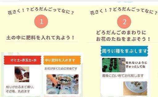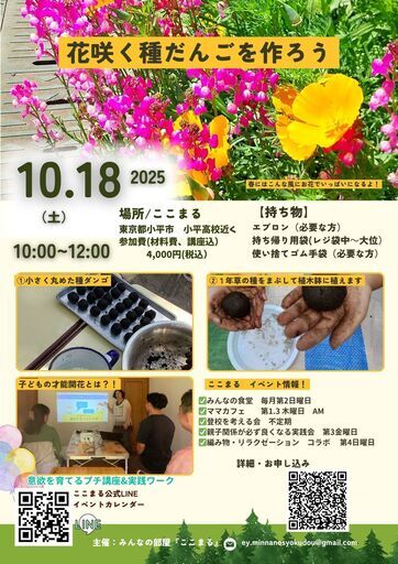 【花咲く種ダンゴを作ろう】🌼ワークショップのご案内です🌼🍀日時:10月18日(土)10:00~12:00🍀場所:ここまる部屋(小平市)🍀5歳以上の親子大人だけの参加も大歓迎! 🍀参加費:4000円(材料代含む)🌸子どもの才能を開花させるミニ講座もついています子どもの頃に泥ダンゴを作った記憶はありませんか。二種類の泥を混ぜて、粘土状になるまでこねます小さなダンゴに丸めて、そこに春に開花する花の種をまぶしますそして、土(植木鉢)に植えます春になったら、可愛いお花が次々に咲きます(花)🌼種ダンゴのよさ🌼🔷土を触ることで五感の成長を促します🔷植物の成長や開花を楽しみに待ち、愛しむ心を育てます🔷継続してお世話することで気づきや発見を経験します🔷子どもだけでなく、大人もワクワクしたり楽しむ事ができます今回は子どもの才能を開花させるためのミニ講座もついています!お申込みはコチラ⬇️ https://forms.gle/6TPwFMgDfv8Nu4Z98皆様のご参加を心よりお待ちしております🌱