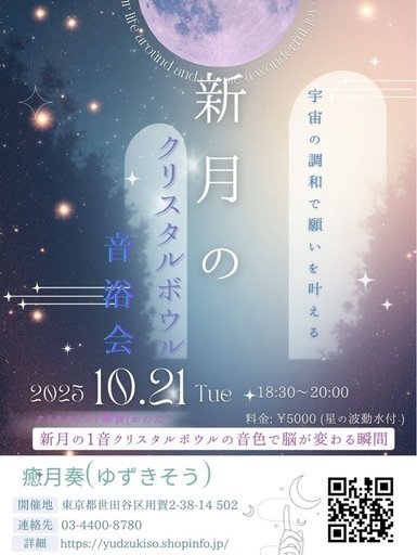 新月のクリスタルボウル音浴会~宇宙の調和で願いを叶える~10月21日(火)18:30〜新月✨の日に開催いたします⭐️ご縁があって、クリスタリストの華音(かのん)さんと癒月奏とのコラボ企画が決まりました💓クリスタルボウルには引き寄せるパワーがあります!華音さんのクリスタルボウルの波動と癒月奏の波動が共振共鳴して、宇宙からのサポートで願いを叶えましょう!ピアニストであり、純正律や宇宙、星のことなどにお詳しい華音さんが奏でる音の魔法で癒されてください🧜♀️🧚♀️この音浴ワークでは、クリスタルボウルの響きと星のエネルギーを通して、内なる調和を整え、宇宙と共鳴しながら新しい願いを形にしていくことがコンセプトになります。天秤座の新月は「調和」「バランス」「パートナーシップ」を象徴するタイミング。ぜひご参加下さい✨🪐🪽💫お待ちしておりま〜す✨🌌🌠音浴会の予約サイトのリンク https://reserva.be/soundbath癒月奏のウェブサイト https://yudzukiso.shopinfo.jp/〜〜〜〜〜〜〜〜〜〜〜〜🌕癒月奏の理念に共鳴し、音浴会やワークショップを開催したい方を募集中です⭐️〜〜〜〜〜〜〜〜〜〜〜〜