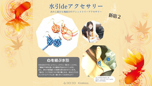 【水引deアクセサリー】好きな色はもちろん、推しカラーやラッキーカラーを取り入れたかわいい和風アクセサリーをつくってみませんか??伝統と現代が融合した、水引deアクセサリーを体験です♡『水引ってなぁに??』水引はご祝儀袋や贈り物などに古来から使用される飾り紐のことで、紐を結ぶことから縁結びの意味があったり、結び方にも縁起の良い意味を持ちあわせています。伝統的な結び方のあわじ結びと梅結びでアシンメトリーアクセサリーを作成できます。アクセサリーの種類はピアス、イヤリング、チャームからお選びいただけます。あわじ結びは絆を強め、末永く付き合う意味を持つ結び方で、梅結びには、固く結ばれた絆、運命の向上などのを意味があります。伝統的な結び方にはこのような縁起の良い意味があるため、大切な人への贈り物や自分自身へのご褒美にも最適です。水引の色は約50カラーから選べ、オリジナルカラーの組み合わせを楽しめます。またビーズやラインストーンを使っておしゃれにカスタマイズをすることも可能です。あなたの個性を活かし、縁起の良いオリジナルの水引アクセサリーをつくりましょう♪✼••┈┈┈┈••✼••┈┈┈┈••✼【日時】10月25日(土) 13:00~14:30※ゆっくりカスタマイズできるように余裕を持って設定しています。制作時間には個人差があり、また参加人数などにもより早く終了する場合もあります。【会場】Studio.m (新宿レンタルスタジオ) 東京都新宿区新宿5-15-2 池与ビル203【アクセス】・各線「新宿三丁目」駅E2もしくはE1から徒歩2分・各線「新宿」駅東口から徒歩10分【参加費/材料費込】3,500円~ あわじと梅のアシンメトリーアクセサリー※事前銀行振込/当日現金支払いはプラス500円※予約サイトは手数料の関係上、金額が変わります。【製作時間】45分~1時間半目安 ※個人差あり【定員】4名 【対象年齢】小学校3年生以上推奨~お年寄りまで【持ち物】必要に応じて下記をご持参ください。・お飲み物(ペットボトル)・メガネ【申込方法】①ご予約フォーム/新宿ワークショップ https://ssl.form-mailer.jp/fms/ed055f2d834128②体験予約サイト『aini』 https://helloaini.com/travels/52571?prcd=dNVe☝10/18までwelcomeクーポン10%発行中③まなびのマーケット『ストアカ』水引deアクセサリー 〜あわじと梅のアシンメトリー〜 in新宿 https://www.street-academy.com/myclass/183369?conversion_name=direct_message&tracking_code=6b47c40471d491ec434ecd7d0670f844【ご了承事項】・スタジオのため、靴を脱いで裸足またはスリッパでお上がりいただくことになります。ご承知おきください。・お手洗いがフロア共同の和式1か所のみになります。徒歩1分ほどに綺麗なお手洗いがありますので、用を済ませてからのお越しをオススメします。(事前に場所をご案内します)・完成作品の撮影またワークショップレポートとしてHPやSNSなどへの作品の掲載をさせてください。・料金や特典は手数料の関係で、予約ルートにより多少異なる場合があります。・他サイトや直接申込でも募集しているため、ジモティやaini以外からの参加者がいる場合もあります。・時間内に間に合わない場合は手伝わせていただきます。・アクセサリーの金具は自分でつけられない方だけお手伝いいたします。・気に入った見本作品があればリーズナブルな価格でご購入いただけます。