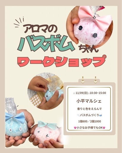 \ 親子で楽しめるワークショップ /アロマの バスボム作り🫧 を開催します!香りと色を選んでころんと可愛い「バスボムちゃん」を作りませんか?☺️💗作って終わりじゃないのが、このワークショップの魅力。・一緒に作る時間・子どもが自分で作る姿を見守る時間・お風呂でしゅわしゅわを一緒に見る時間・ゆっくり温まる時間全部が “思い出になる時間” です🛁✨⸻🌟 参加特典(先着50名)暗いところで光る 秘密の蛍光ペン🎁(お子さま大喜び!)🪷参加費✅ 1個 600円✅ 2個作ると 1000円(お得!)小さなお子さまでも作れます👧👦親子・お友だち同士のご参加も大歓迎!⸻📅開催日時11月9日(日) 10:30〜15:00📍会場小平マルシェ vol.15village green(ヴィレッジグリーン)👉 小平市天神町3丁目7-1