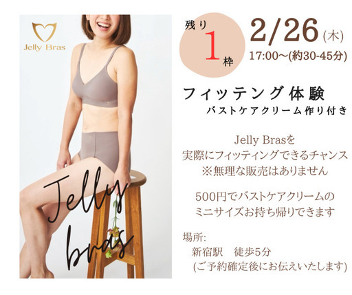 【女性限定💁♀️】通常は満席の時間帯ですが、2/26(木)17:00〜のみ、1枠だけご案内できることになりました。この枠は✅1対1でゆっくりフィッティング✅下着サイズのお悩みを個別相談✅バストケアクリーム作り体験付き(材料費500円)という、特別枠です。【こんな方におすすめ🕊️】・自分のサイズがよく分からない・締め付けない下着を試してみたい・下着を買わされそうで今まで行けなかった・まずは相談だけしてみたい※無理な販売は一切ありません※相談・体験のみでもOKです【内容👙】・下着のサイズ診断・フィッティング・バストケアの基本レクチャー・ご自身で作るバストケアクリーム(ミニサイズ)お持ち帰り【当日参加費🫧】500円(材料費として)※当日、JellyBras商品をオーダーをされる場合は商品代も頂戴します。【日時・人数🗓️】・2/26(水)17:00〜・1名限定※女性限定※こちらの枠のみの募集です※定員に達し次第、受付終了となります【場所📍】新宿駅 徒歩5分※詳細はご予約確定後にご案内します百貨店でのpop up実績をもつJelly Brasの体験会です✨ 「気になっていたけど、きっかけがなかった」そんな方にこそおすすめのたった1枠です。