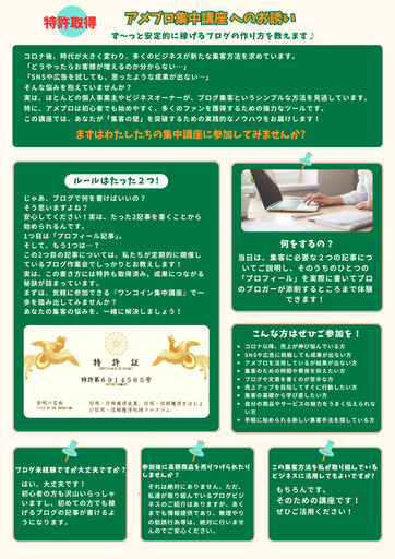 「ブログで集客を増やしたい」「初心者でもできる方法が知りたい」そんな方にぴったりの講座です!アメブロ初心者向けに、効果的な記事の書き方から集客につながるコツまでを徹底解説。さらに、プロのブロガーがその場で記事を添削してくれるため、即実践に役立つ内容です。たった500円で、大きな成果が期待できるブログ運営をスタートしてみませんか?日時:2025年1月13日(月曜・祝日)13:00~15:00場所:ルックハイツ新宿607号室 ライト会議室参加費:500円持ち物:パソコンまたはスマホ(文字入力のできるもの)【こんな方におすすめ】ブログ初心者の方アメブロを使って集客したい個人事業主や自営業者売り上げが落ち込んでいて、新しい集客方法を探している方【この講座が選ばれる理由】初心者さん大歓迎! わかりやすい解説で安心して学べます。プロのブロガーがその場で添削! 自分の記事を即ブラッシュアップできる。参加費たった500円! コスパ抜群で気軽に学べる。【参加者の声】「プロのアドバイスで記事の質が格段に向上したのは驚きです。すぐに実践できる内容でした。」(40代女性)少人数制のため、じっくり学べます。先着順なのでお早めにお申し込みください!