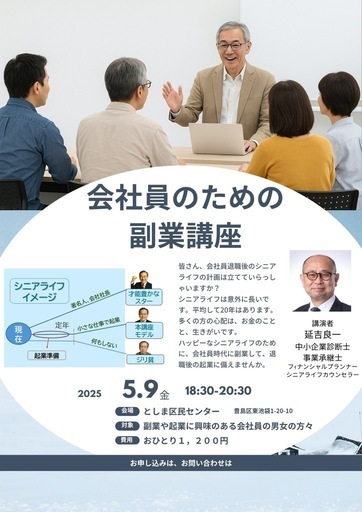 5/9(金)✴️退職後のシニアライフを見据えて✴️ 『現役会社員のための副業講座』 今、現役会社員のみなさん、退職後のシニアライフの計画は立てていますか?アクティブに、例えば、退職後はこれまでの会社員時代の雇われの立場から、独立・起業への道を歩む、こんな人生はどうでしょう。しかし、自分にそんなことができるかと不安になる方も多いことでしょう。これまで、会社員として雇われの立場から、何の準備もなく独立・起業はリスクがあります。✴️会社員時代の副業のすすめ 何をやるにも準備が必要です。その前に何をやるかを決める必要があります。自分の好きなことや得意なことのなかから、お客様のニーズに合った、求めている物を探してください。長い人生で培ったあなた独自のものが必ずあるはずです。そして、起業前に副業でスモール起業して、テストしておく事をお勧めしています。✴️副業の仕方 会社員には安定した生活があります。 ですから、そのメリットを受けながら、シニアライフでの起業を、在職中に副業として、準備しておくのです。✴️何をすればいい? 注意しなければならないのは、現在お勤めの会社の「副業規定」です。副業についての規定がなくとも、副業開始前に、会社の総務部門に問い合わせておくことが、トラブルを未然に防ぐためにも大切です。 副業ができない場合でも、準備はできます。資格を取っておくとか、各種調査をしておくとか色々あります。✴️こんな人にお勧め・シニアライフをアクティブに、そしてお金も儲けたい方・会社員としての生活に大きな不満はなかったが、これだけではつまらないと思っている方・社会問題に真剣に取り組み、明るい将来に貢献したいと思っている方✳️セミナー日時と会場 ●日時:令和7年5月9日(金)18:30~20:30 ●場所:としま区民センター502豊島区東池袋1-20-10 https://toshima-civic-center.jp/access/♦️JR他各線「池袋駅」東口より徒歩7分 ●参加費:おひとり1,200円 ●講師:延吉良一(中小企業診断士、事業承継士、シニアライフカウンセラー) 🔵お申込先 https://forms.gle/NjUAr1gHxVbH4AQVA🟡連絡先EGSご縁倶楽部小沼光博 https://lin.ee/VuNvIG7