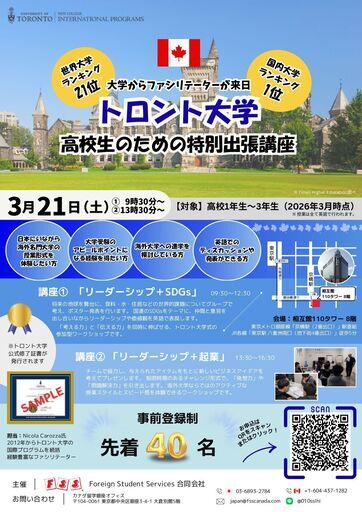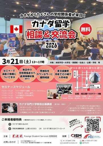 カナダ留学相談&交流会in東京・トロント大学の特別講座のお知らせカナダ留学相談&交流会カナダから来日する学校関係者・カナダ在住日本人カウンセラーに、直接留学についてお聞きいただけます。各ブースには通訳がいますので、安心してご相談ください。<このイベントでできること>・カナダの学校関係者から直接情報収集・カナダ留学セミナー(テーマ別)・現地在住留学カウンセラーに個別相談・カナダ名門大学特別出張講座(有料)日時:3月21日(土)13時~17時(入退場自由)入場料:無料名門トロント大学の講師による特別講座(有料)も開講決定!要予約・先着40名限定となりますのでお早めにご確認ください。イベント詳細(参加校など)・事前登録は、以下のリンクよりご確認くださいませ https://fsscanada.co.jp/about_fairs/fair-2026/education-fair-2026-tokyo-march/事前登録をしてご来場いただいた方には特典もあります!ぜひご来場ください。FSSカナダ留学
