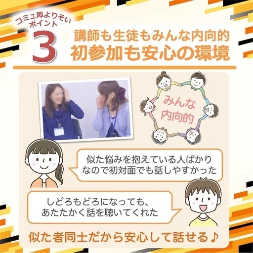 会話術の本を読んだり、セミナーを受けたりしてみたけど、一向にコミュ障は治らなかった…それはただ、あなたに適した方法ではなかった”だけ”かもしれません。内向的な性格にマッチした手法を学び、きちんと練習を積み重ねる。そうすれば今からだって会話を楽しめるようになります!* * * * * * * * * *コミュ障によりそう話し方教室『ハナサク会話堂』詳細や受講の申込はホームページからどうぞ! https://school.hanasaku-kaiwa.com* * * * * * * * * *「仕事上の会話はできるんだけど、 雑談になると途端に なにを話せばいいのかわからない…」あなたは、こんな悩みを抱えていませんか?そんな人の会話を聞いてみると、こんな感じだったりします。================相 手「今日は暑いですねー」あなた「はい。最高気温は 30℃超えるらしいですね」================相 手「私は名古屋出身なんです」あなた「名古屋って言うと… 味噌カツが有名ですよね」================これでは親しい関係は築けません。なぜなら「情報のやりとり」しかないからです。人に好かれる話し方のカギは、「あなたの人がら」にあります。あなたの人となりが伝わるような話をすれば、もっと人から興味や親しみを持ってもらえるようになります♪コツは講座内で丁寧に解説しますし、実践練習の時間もたっぷり確保しているので話す力がしっかり身につきます。また、話し方のコツがわかっても、コミュ障さんの前には次の壁が立ちはだかります。● 実際の会話になると、 何について話せばいいかわからない● 会話中、どうやって話す側に まわればいいかわからないなどの壁です。だから「話そう 話そう」と思いつつも、多くのコミュ障さんはひたすら聞く一方になってしまいがち。結果、いてもいなくても変わらない「ザンネンな人」に…。そんなあなたも、安心してください。内気でも自然にできる【ちょっとずるい自己開示術】を伝授します。ノリもオチも必要ない、内向的なあなたにピッタリの話し方講座です*=================本講座でこんな悩みをスッキリ解決=================● 人と会話するとき、 何を話せばいいかわからなくて 「ただ聞いてるだけ」になってしまう● がんばって話しても 「へぇ」「そう」などの 薄〜い反応しかもらえない● よく知らない話題になると 何も話せなくなってしまう● 「こんなこと話したら嫌われるかな」 といった不安があり 話すことをあきらめてしまう=================他講座にはない3つの特徴=================【 特徴① 】明るいノリや高度な話術を必要としない、内気な人でも使えるスキルを厳選。「コミュ障だからつまづくポイント」も丁寧にフォロー!↓↓ だから ↓↓他の講座に行ってみたけどノウハウが難しくて使いこなせなかった…「元気に明るく!」のような精神論を押し付けられて苦しかった…そんな不満を感じているあなたにオススメ♪【 特徴② 】練習時間をたっぷり設けているから、知識を得るだけでなく「ちゃんと使える会話力」が身につく!↓↓ だから ↓↓ノウハウを学んでも練習相手が身近にいなくて結局身につかない…そんな壁にぶち当たっているあなたにオススメ♪【 特徴③ 】内向的な人を対象にしているから、生徒さんは穏やかな人ばかり。↓↓ だから ↓↓話し方教室って行ったことないけど大丈夫かな…明るいノリを強要されたりしないかな…そんな不安を抱えているあなたにオススメ♪=================講座の会場=================● ワン・デイ・スペース 貸会議室東京都 渋谷区 代々木1-38-7「TH YOYOGI」4階・JR 代々木駅(西口)から徒歩1分・JR 新宿駅(南口)から徒歩10分* * * * * * * * * * * *年間150人以上が受講!話し方教室『ハナサク会話堂』は「内向的なコミュ障さん」を専門に教える日本で唯一の話し方教室です。◆ 詳細・申込はホームページへ https://school.hanasaku-kaiwa.com◆ 無料の動画レッスン、プレゼント中 https://school.hanasaku-kaiwa.com/free-seminar/-