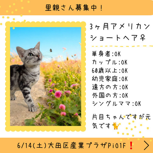 6/14(土)東京都大田区産業プラザPiO1F大展示ホールで開催の譲渡会でお見合いできます。