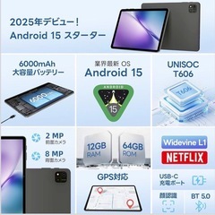 数ある中からご覧頂きありがとうございます(^○^) ◎✨️値下げ交渉◎✨️ ◎コメントなし、即購入大歓迎✧ ◎送料無料!安心の匿名配送 *。┈┈┈┈┈┈┈┈┈┈┈┈┈┈┈*。 ✨️\1品限り!!早い者勝ち!!/✨ ★商品説明★ 【10インチフルHDタブレット|高精細IPSパネル搭載|広視野角設計|Widevine L1認証対応】 1280×800の高解像度を実現。利便性に加え、IPS方式のフルラミネーション液晶パネル採用により高精細な画質と優れた視認性を兼ね備えています。このタブレット Android搭載モデルは、300nitの高輝度と178度の超広視野角で、あらゆる環境で鮮明な映像表示が可能。さらにタブレット 10インチクラスならではの大画面体験と、Widevine L1認証対応によりフルHD再生が保証。 【Android 15搭載・高性能タブレット|高速オクタコアCPU・強化セキュリティ・長時間駆動】YouTube視聴用タブレットとして最適です。Android 15搭載で、生体認証の顔認識ロックやデータプライバシー保護、アクセシビリティ機能を強化。 【12GB大容量メモリ|多用途対応|メモリ確認機能|高性能タブレット】 4GB実装RAMと8GB仮想RAMを組み合わせた合計12GBメモリを搭載。64GB内蔵ストレージに加え、マイクロSDカードで拡張可能です。 【高容量6,000mAhバッテリー & 18W PD高速充電 ダブル搭載】 6,000mAhバッテリーを搭載し、動画視聴・ウェブブラウジング・音楽再生などにおける長時間連続使用を実現。充電と音楽再生の同時利用が可能です。急速充電技術を採用し、短時間充電で迅速に使用再開できるのが特長です。 【2.4GHz/5GHz 同時接続対応 Wi-Fi & Bluetooth 5.0内蔵】 2.4GHz/5GHzデュアルバンドで最大433Mbpsの高速通信を実現。さらにBluetooth 5.0を搭載し、省電力かつ高速なワイヤレス接続でゲームコントローラーやイヤホンなどとシームレスに連携可能。 【GPS・子供見守り機能搭載|FMラジオ】 ワイヤレス投影とフローティングウィンドウ機能でマルチタスクが可能で、GPSとFMラジオを内蔵しオフラインナビも利用できます。子供向け保護機能や使用時間管理も備えております。