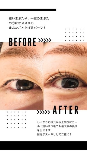 通常のまつ毛パーマとは違うアプローチで、まぶたを眼輪筋ごと引き上げます。通常のまつ毛パーマとは異なります。まぶたが重い、目が開きにくい、まぶたがたるんで二重に乗っている、二重がハッキリしないなどまぶたのお悩みがある方、まつげが短い方にもオススメです!継続して頂く事でまぶたの上がりが定着します。(仕上がりには個人差があります。一度ではまぶたが上がらない事もございます。)一度の施術で、パーマがかかっている間はまぶたの状態を保てます🉐月1の施術をお勧めしています✨※整形ではないので、確実に二重になるものではございません。ブラックティントをオプションでする事で、パーマのもちがアップし、黒くコシのあるまつ毛に仕上げます✨通常価格¥7,800モデル価格¥5,000通常のまつ毛パーマ、眉毛Waxも施術できます✨お気軽にお問い合わせ下さい♪