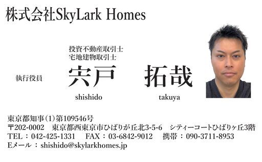 弊社は東京都を中心に不動産仲介業をしております東京都西東京市の株式会社SkyLark Homes 宍戸 拓哉(ししど たくや)でございます。