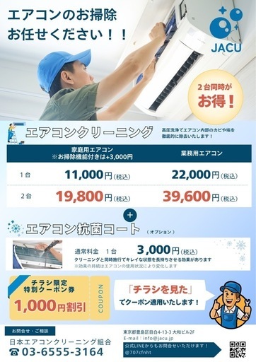 【夏本番前に】電気代と冷えの悩み、エアコン清掃で解決しませんか?日本エアコンクリーニング組合と申します。以下のようなお悩みはございませんか?✅ エアコンの効きが悪い✅ 電気代が去年より高い✅ 店内の空気が少しこもって感じる実はこれ、室内機ではなく「室外機の汚れ」が原因のことも多いです。当組合では、室内外セットのクリーニングで、最大30%の電気代削減につながった事例もございます。■今だけキャンペーン中!「ジモティ見た」で割引き適用!!料金や作業時間など、気になることがあればお気軽にLINEまたはフォームからご相談ください😊▼詳細はこちら▼ http://jacu.jp/for-customer/