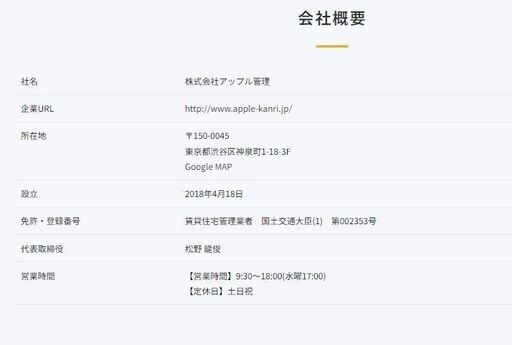 以下の様なことでお困り/心配事はございませんか?・現在の賃貸管理会社と、タイムリーな連絡が取り辛く、意思疎通もはかれてていない。・現在の賃貸管理手数料(3%-5%/月、ひと部屋3,000円以上/月など)が高い。・設備機器故障際の請求費用が高い。中抜きされているのではないか。・退去時の原状回復工事の貸主(オーナー)負担割合が大きい。国土交通省のガイドラインに沿った処理ではないのか。・退去後、次の方の入居が(3ヶ月以上など)決まらない。■■■■■■■■■■ 当社なら ■■■■■■■■■■★連絡は、LINEやEmailでタイムリーかつスピーディです。★ひと部屋月額なんと500円+税/月で管理可能です。※一棟ビル・店舗等は個別にご相談ください。★工事等のご請求は【完全見える化】で対応業者請求(書)費用のままのご請求です。★当社なら、国土交通省ガイドラインに沿って入居者(退去者)様へもキチンと請求させていただきます。結果、貸主(オーナ様)負担分が減額されることがほとんどです。会社は渋谷にございますが、管理エリアは渋谷からドアtoドアで約1時間圏内まで可能です。例:立川や三鷹、横浜市や川崎市、大和市、川口市や浦和、さいたま市(一部)なども可です。エリア等の詳細はご相談ください。※原則、千葉県内は不可です。まずは、お気軽にごお問い合わせください。ジモティ経由でも、HPからでも、どちらからでもお受けしております。■株式会社アップル管理株式会社アップル管理|渋谷区の不動産会社 ワンコイン賃貸管理 賃貸経営コンサルティング 相続対策 セミナー ワンコイン管理 区分マンション アパート 1棟マンション 収益物件 親会社株式会社アップルアドバイザーズ (apple-kanri.jp)■株式会社アップルアドバイザーズ株式会社アップルアドバイザーズ|渋谷区の不動産会社 賃貸 管理 購入 売却 仲介 不動産コンサルティング 賃貸経営コンサルティング 相続対策 収益物件 アパート 区分マンション 1棟マンション 関連会社 株式会社アップル管理 ワンコイン賃貸管理 株式会社APトラスト (appleadvisers.jp)