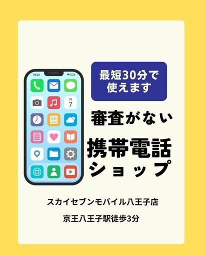 審査なし!どなたでも契約可能 📱スカイセブンモバイル八王子店今だけお得なキャンペーン実施中!・事務手数料 無料・ネットフリックス 2,000円分プレゼント・その他、さまざまな特典をご用意毎月恒例の抽選会では、嬉しいプレゼントが当たるチャンスも!こんなお悩み、すべて解決!・マイナンバーカードなしでもOK・免許証なしでもOK・クレジットカード不要・銀行口座なしでも契約可能審査が通らず困っている方も大歓迎!お支払いは、銀行引き落としまたは振り込みが選べます。📩 郵送物なしでプライバシーも安心!料金明細はメールで受け取り、マイページでも確認可能です。契約後のサポートも充実安心してご利用いただけるよう、しっかりサポートいたします。西国分寺線・拝島線~徒歩5分!