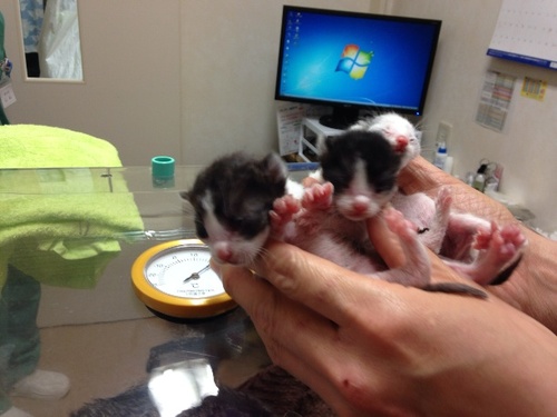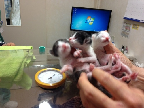 親猫と産まれたての子猫が箱に入れられた状態で捨てられていました。母猫はとても人懐っこい性格です。白に黒ちゃんとグレーに白と白にブチちゃんの3匹です。母猫はキジに白です。まだ目もあいていません。動物病院さんで見てもらった所生後1週間以内との事でした。4匹まとめての引き取り希望です。どなたか飼って貰える人がおられましたらどうかよろしくお願いします。(>人<;)