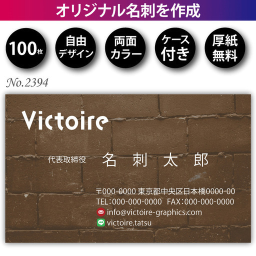 ■価格:1,480円■枚数:100枚■名刺サイズ:55mmx91mm■両面フルカラー印刷■用紙と厚みは以下からお選び下さい。①光沢あり、厚さ普通②光沢あり、厚め③光沢なし、厚さ普通④光沢なし、厚め■デザインNo.2394※ 裏面もフルカラー印刷が可能です。※ 納期はデザイン確定後1週間程度でお考え下さい。※ 紙ケース付きです。※ 印刷は大手印刷会社にて行います。※ 送料(ネコポス)は無料です。※ ご質問などございましたら、住所欄にメールを記載しております。※ 他のデザインは、ネット検索のグーグルで『販売支援のヴィクトワール』で検索して下さい。#名刺#名刺作成#名刺印刷#格安#作成#デザイン#ポイントカード#スタンプカード#ショップカード#おしゃれ#安い#ペット名刺#ヴィクトワール#販売支援のヴィクトワール