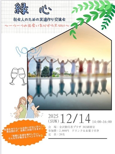 【残り5名のみ!最終のご案内です】現在、参加予定の方が 15名/20名 まで増えてきました。気になっている方は、お早めにお申し込みお願いします🙇💦⸻ “縁心”(えんしん)ってどんな会?人が大人になるにつれて感じやすい、こんな想い—— • 「気づけば話せる友達が少なくなっていた」 • 「引っ越してきたばかりで、知り合いがいない…」 • 「気軽に話せる友達が欲しい」そんな気持ちに寄り添って生まれた、リラックスして参加できる交流イベントです。☕ イベントの雰囲気と特徴前回参加された方から好評だった内容をもとに、今回はさらに企画をブラッシュアップ✨自然と会話が生まれるミニゲームや、初参加の方でも安心して過ごせるよう“温かい雰囲気づくり”を目指して運営しています。「行ってみたら意外と話しやすかった!」そんな前向きな時間をお届けできればと思っています🍀📅 開催情報日付:2025年12月14日(日)時間:14:00〜16:00(受付13:30〜)場所:金沢勤労者プラザ 302号室参加費:2,000円(男女共通/飲み物&お菓子付き・現金のみ)🚫 注意事項このイベントは “友達づくり” を目的にしています。営業行為・宗教勧誘・恋愛目的の方はご遠慮ください❌📩 申し込みについてお申込みは 2枚目の画像(QR案内) からお願いします。質問などもお気軽にお待ちしいます☺️
