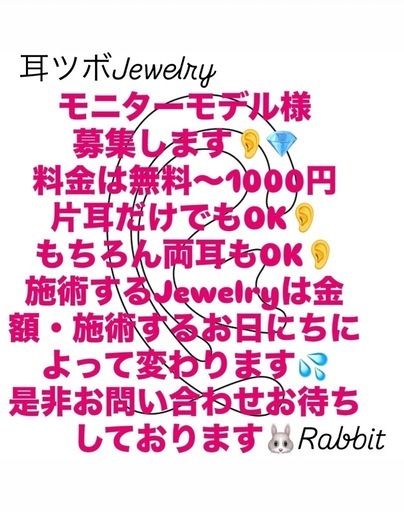 空き、随時更新中!!!11月7日(金)14日(金)21日(金)28日(金)滑川市19時〰️20時半最終受付18日(火)19日(水)20日(木)21日(金)~17時最終受付富山市9時~20時半最終受付片耳4粒施術モデル様👂無料0円両耳12粒施術モデル様👂500円付け放題施術モデル様👂1000円耳ツボジュエリーモデルさん募集します!身体の不調にアプローチして、可愛い美容体験しませんか?施術時間はおひとり20~40分程を予定しております。トレンド入りした耳ツボジュエリー💎美容好きな方♥️流行り好きな方♥️可愛いの好き♥️今週のデート前に♥️身体の不調を見つけたい方👂是非1度ご体験いただけると嬉しいです✨️無理な勧誘、コース予約等しておりません🍀1度のみのご体験もお気軽にお問い合わせお待ちしております💌耳ツボJewelry👂💎Rabbit🐰