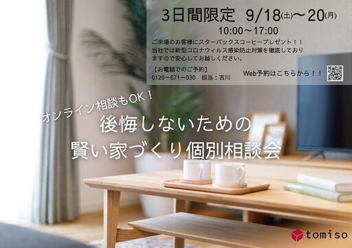 家づくりを計画している方に向けまして、3日間限定の個別相談会を開催します。家づくりで後悔しない為の、気を付けるべきポイントや気になるお金のことなど、なんでも個別で相談いただけます。家づくりを始めたいけどお金のことなど不安がある方、これから家づくりを始められる方、もう始めているけどなかなか思うように進んでいない方、疑問や不明点を解消して後悔しない家づくりをしませんか!!参加は無料でご予約制となっております。オンラインでの相談も受け付けておりますので、お問合せ・参加お申込みお待ちしております!新型コロナウイルス感染防止対策として、ご対応は1組ずつとさせていただきます。ご来社いただく際には、手指のアルコール消毒、マスクの着用、検温にご協力をお願いしております。ご理解・ご協力の程よろしくお願いいたします。【場所】トミソー本社【日時】9月18日(土)~20日(月)【時間】10:00~17:00参加のご予約はこちらから https://www.housingbazar.jp/features/detail_new.php?id=12165