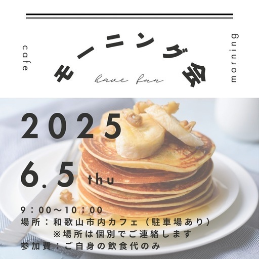 【2名様限定⭐️和歌山市モーニング会🥞🫧✨】ゆったりとしたモーニングを楽しみながら、気軽におしゃべりしませんか?定員8名様で、残り2名様です!☕️日時:2025年6月5日(木)9:00〜10:00📍場所:和歌山市内カフェ(駐車場あり) (ご参加の方には個別でご連絡差し上げます)💰参加費:ご自身の飲食代のみ「気軽に話したい」「新しいつながりが欲しい」という方は、ぜひご参加ください♪皆さまとお会いできるのを楽しみにしています!参加ご希望の方はメッセージをお送りください✨当日に連絡がつかなくなる方がいたため、参加の方には連絡用のオープンチャットの参加をお願いしております。6/3(火)に募集締め切ります!