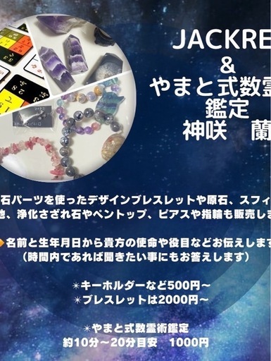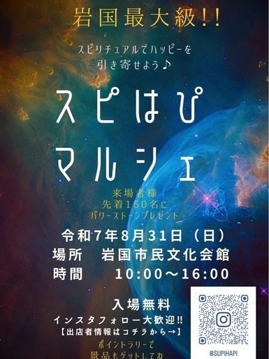 🌈✨スピハピマルシェ 出店のお知らせ✨🌈📅 日時:8月31日(土)10:00~16:00📍 会場:岩国市民会館⭐️岩国最大級のスピチュアルマルシェ🔮 なんと 33ブース が大集合🎪このたびお声かけをいただき、初出店させていただくことになりました✨💎 天然石アクセサリー JACK REI × やまと式数霊鑑定 💎特別コラボでの出店です!🌸やまと式数霊鑑定🌸お名前と生年月日から、あなたの役目や魅力を数霊で紐解きます。さらに今回は、数霊で作る天然石キーリング付き✨ 3,000円!(ご希望があれば「神様カード」で占いも💫)💎【天然石販売】・水晶、モリオンの原石やさざれ石・魔除け最強デザインのブレスレットどれも天然石なのにリーズナブルで手に取りやすい価格です🌿癒しとパワーがぎゅっと詰まったブースでお待ちしています✨