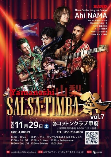 サルサ&ティンバはやっぱり生音が一番‼️ということで、サルサ&ティンバを生演奏で存分に楽しんじゃおうというこのイベント。昨年11月に開催されて大盛況だった"山梨サルサ・ティンバ祭り🎶"今年もやりますよ〜‼️今年は11/29(土)《いい肉の日》に決定‼️生音担当は毎年恒例のGrupo Ahi Nama‼️ラテンボーカリスト&サルサインストラクターとしても活躍する奈奈カンタリーナさんをはじめ、第一線で活躍するラテンアーティストの皆様が大集結‼️ライブ前にキューバンサルサ&ルエダのレッスンもありますよー‼︎ 是非とも生音サルサ&ティンバを一緒に楽しみましょう😊🎶"今年の山梨サルサティンバ祭りは11/29(土)、"いい肉の日"、を合言葉に、是非是非ご参加よろしくお願いします🙇【日時】2025年11月29日(土)14:00〜19:00【会場】コットンクラブ甲府(甲府市中央4丁目3−20)【料金】4,000円【スケジュール】14:00〜Open/14:15〜キューバンサルサ&ルエダレッスン15:00〜ライブ1st15:50〜DJタイム16:20〜パフォーマンス16:50〜ライブ2nd17:50〜DJタイム19:00 Close【Grupo Ahi Namaメンバー】奈奈カンタリーナ Vocal/Percusión斎藤タカヤPiano/coro小泉哲夫Bass/coro吉羽一星Timbales/coro相川等Trombón/coro荒川"B"琢哉 Conga/coro【DJ】King-MambothUやのっち【問い合わせ】yamanashi_salsa_timba@yahoo.co.jp