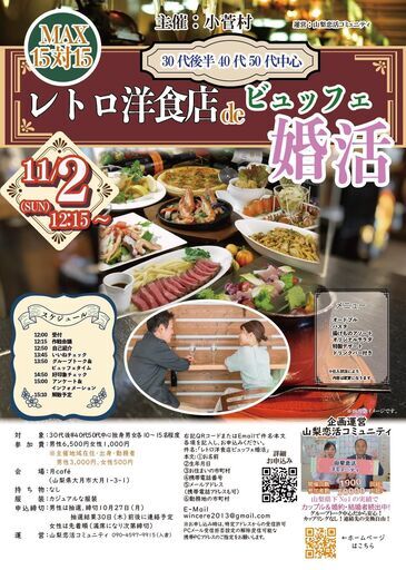2025年11月の1週目は、秋の出会いが盛りだくさん🍁✨真剣な出会いから趣味友探しまで、気軽に参加できる恋活・婚活イベントをピックアップしました💑📅 イベント一覧💐 11/1(土)18時~MAX20対20のビッグパーティー!【男性25~32歳/女性24~34歳】20代後半~30歳前後中心✨正社員or安定収入男子to恋活(お酒あり)👉 https://www.koikatsu20.com/marriage2025-11-1/🍴 11/2(日)12時15分~【小菅村主催】30代後半~50代中心!レトロ洋食店でビュッフェ婚活🍽️👉 https://www.irikurakekkon.com/13084/🥐 11/2(日)12時30分~秋のパン祭り!【男性32~42歳/女性31~43歳】ヴィ・ド・フランスのパンを食べつくすプチ贅沢婚活♪👉 https://www.wincere2012.com/marriage2025-11-2e/🏠 11/2(日)17時30分~【50代60代中心】恋活ホームパーティー👉 https://www.wincere2012.com/marriage2025-11-2n/☕ 11/3(月)12時30分~スタバのデザート&ペストリーがいっぱい!【男性26~36歳/女性25~37歳】20代後半30代前半中心のカフェ恋活☕👉 https://www.koikatsu20.com/marriage2025-11-3e/🌹 11/3(月)17時20分~ヒナ企画★【男性31~42歳/女性29~42歳】マッチング合コン💫👉 https://www.koikatsu20.com/marriage2025-11-3h/💞 11/3(月)17時30分~【28~39歳】同年代で出会いたい人が集まる婚活✨👉 https://www.wincere2012.com/marriage2025-11-3n/📩 すべて事前予約制!気になるイベントは早めのエントリーがおすすめ✨少人数でじっくり話したい方も、ワイワイ楽しみたい方も、自分に合ったスタイルで素敵な出会いを見つけましょう🌈主催:山梨恋活コミュニティ📧 お問い合わせ:wincere2013@gmail.com