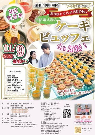 💒✨11月9日(日)14:10~開催✨💒🍰結婚式場のケーキビュッフェ婚活 in エクシブ山中湖🍰山中湖村主催🌿地元でも評判の【結婚式場スイーツ】を楽しみながら出会える、特別感たっぷりの婚活イベントです💗「非日常の空間で出会いたい✨」「甘いケーキと一緒に楽しい時間を過ごしたい🍓」そんな方にぴったりの大人気企画です💐🧁結婚式場ならではの豪華なケーキビュッフェ付き!おいしいスイーツを楽しみながら、ゆったり会話が弾む時間を🎵💰参加費: 男性 10,000円(主催地域在住者 8,500円) 女性 1,500円(主催地域在住者 1,000円)📢男性は抽選、女性は先着順✨婚活イベントでは早めに満席になることも多いので、「気になるかも!」と思ったらぜひお早めにお申込みください💌🍀甘いスイーツ×美しいロケーション×運命の出会い🍀この特別な一日で、素敵なご縁を見つけてみませんか?💞📅 日程:2025年11月9日(日)14:10~📍 会場:エクシブ山中湖(山中湖村)🏡 主催:山中湖村 https://www.irikurakekkon.com/12633/