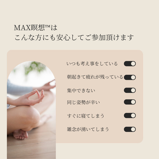 MAX MEDITATION SYSTEM™ブッダは言いました。「瞑想をしないものは無知である」。いまや、企業で当たり前のように取り入れられ脳科学でもその効果の研究が進んでいる瞑想。けれど瞑想の、本当の意味や効能をどれほどご存知でしょうか?「立ったまま瞑想」「10分で瞑想」…。お手軽で簡単、すぐできる瞑想法があちこちに広がっている中、モダンミステリースクールで伝えられているMAX瞑想™は決してインスタントな瞑想ではありません。しっかり時間をかけて、あなたのマインドの中の余計なゴミ=雑念を丹念に取り去っていく「至高の瞑想」です。果てしない銀河と繋がる、永遠のようなリラックスタイム。「MAX瞑想システム™️」とは40年もの長きに渡って瞑想を日課として取り組んで来たファウンダー・グッドニー グドナソン博士が、考案したオリジナルな瞑想の手法。初心者でもシータ波、いわゆる眠る寸前のような深いリラックスの境地に到達でき、静かで穏やかなマインドの状態をもたらします。この20年ほどで、スウェーデン、ロンドン、カナダ、アメリカ、ブラジル、イスラエル、南アフリカ、韓国…など世界各地に広がり、多くの企業の重役や学者、アーティストやセレブリティの方々にも人気を博してきました。脳が疲れる「脳疲労」が体や心の様々な深い症状を起こす大きな原因の1つ。というのも脳が疲れることで良い睡眠の妨げになることも。脳は心と体の司令塔。脳内もしっかりデットクスしていきましょう。「どうしても雑念が消えない」「本物の瞑想を体験したい」「真のリラックスを得たい」「王者・成功者のマインドを手に入れたい」という方は是非、MAX瞑想システム™️を体験してください瞑想の後、アロマなお茶会を開催。お時間のある方は是非ご参加ください。お申し込みはこちら https://www.reservestock.jp/events/945888