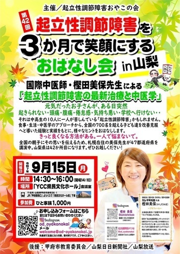 ★起立性調節障害を克服できるヒントがきっとあります第42回 起立性調節障害を3か月で笑顔にする おはなし会 in 山梨✨ 2025年9/15(月㊗️)、山梨県甲府市にて、開催いたします。朝起きられない・頭痛・倦怠感・立ちくらみ、 など、 近年思春期の子供に急増し、 中高生の10人に一人が訴える心身の不調、 「起立性調節障害」。実際に症状を経験し、 克服出来た経験談をはじめ、 生活のおはなし、 食事のおはなし、 同じ症状を持つ皆様とのおはなしも交えながら、 700人を超える 起立性調節障害のお子様達を 改善克服に導いた経験と実績を基に、 「中医学」の視点から、 解決と克服のヒントをお話いたします。◆◆◆◆◆◆◆◆◆◆◆◆◆◆◆◆◆◆◆◆◆◆◆【日時】2025年9月15日(月㊗️)14:30〜16:00【起立性調節障害の最新治療と中医学】 樫田 美保(登録販売者/国際中医師/医科学修士/国際中医薬膳師)【会場】YCC県民文化ホール※JR「甲府駅南口」よりバスで「県民文化ホール前」下車【参加費】ひと家族さま 1,000円(当日会場にて承ります)【主催】起立性調節障害おやこの会【後援】甲府市教育委員会、山梨日日新聞社、山梨放送※定員になり次第締め切らせて頂きます◆◆◆◆◆◆◆◆◆◆◆◆◆◆◆◆◆◆◆◆◆◆◆2022年秋、地元・北海道札幌市からスタートし、全国各都道府県をまわっております「おはなし会」、9月の3か所目は、山梨県甲府市での開催です。ご参加いただく様々な立場の方それぞれに、何かのヒントを感じて頂ける内容を予定しております。同じ症状に悩む方々同士のお話を出来る場でもありますが、単に情報共有だけにとどまらず、それぞれが改善・克服した「その先」、を考えることが出来る会にしたいと願っております。いま現在症状に困っていらっしゃる方、改善の糸口をみつけられないという方、学校・教育関係のみなさま、この機会にぜひ聞いて頂けたらと思います。親子ご一緒でも、保護者の方だけでも、もちろんご参加いただけます。お問合せ・お申し込みをお待ちしております。◆◆◆◆◆◆◆◆◆◆◆◆◆◆◆◆◆◆◆◆◆お問い合わせ・お申込み お待ちしております↓↓ 🔸起立性調節障害おやこの会 (Instagram )@od_oyakonokai 🔹お申込フォーム https://od-oyakonokai.jp/cf-koufu🔸email welcome@od-oyakonokai.jp
